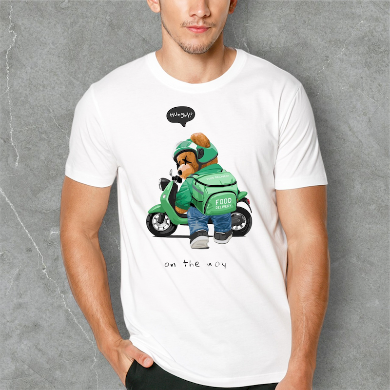 Bỏ sỉ áo thun nam cổ tròn rurumen màu trắng in hình gấu mang balo (có size 4x) giá sỉ tận gốc