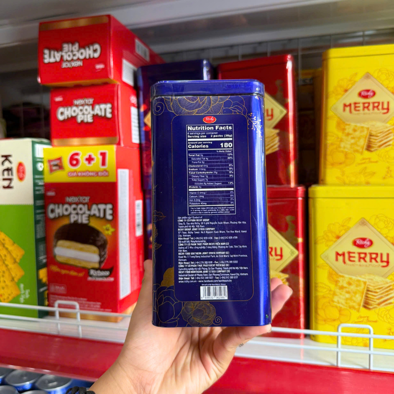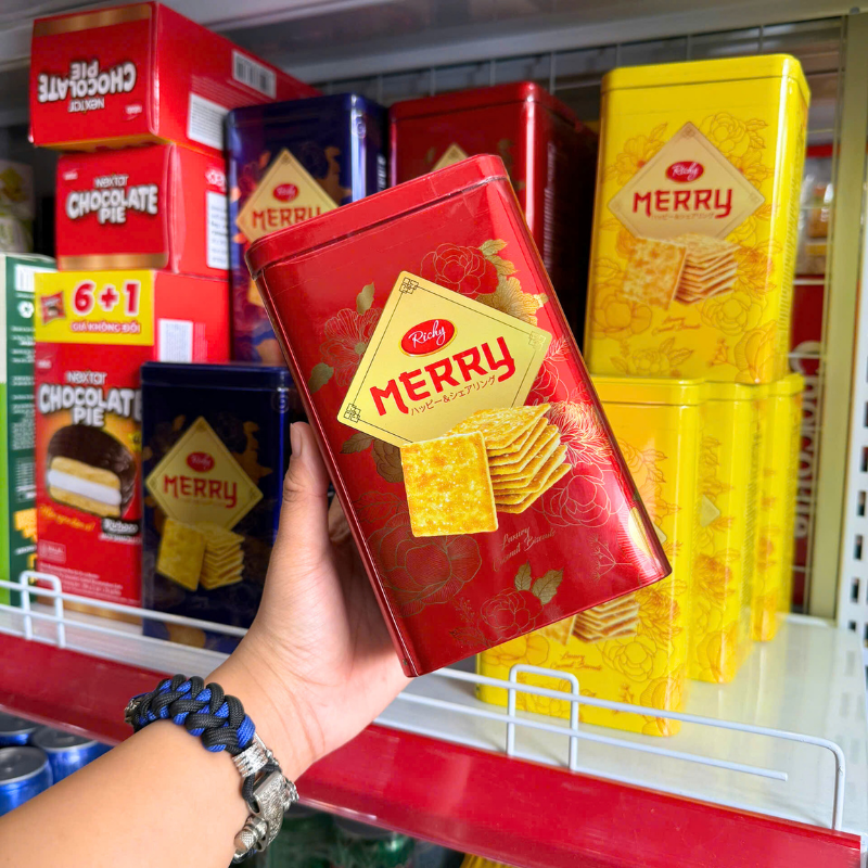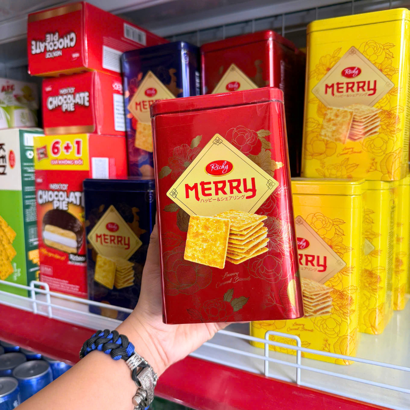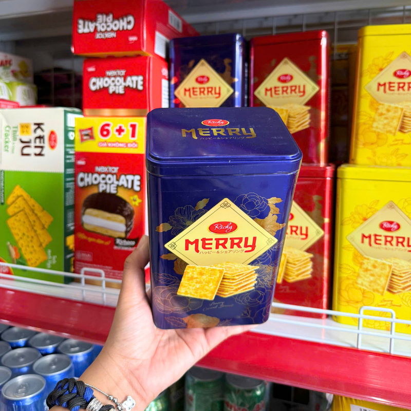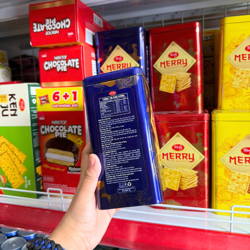 Giá sỉ bánh Quy Đường RICHY MERRY Thiếc Hình Trụ 156g (3 Màu Xanh Dương/ Vàng/ Đỏ)