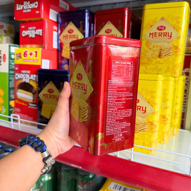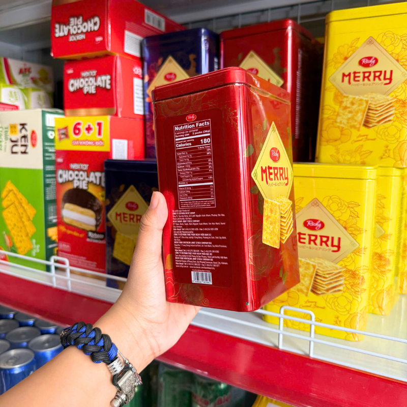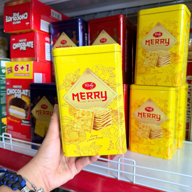Bỏ sỉ giá sỉ bánh quy đường richy merry thiếc hình trụ 156g (3 màu xanh dương/ vàng/ đỏ) giá sỉ tận gốc
