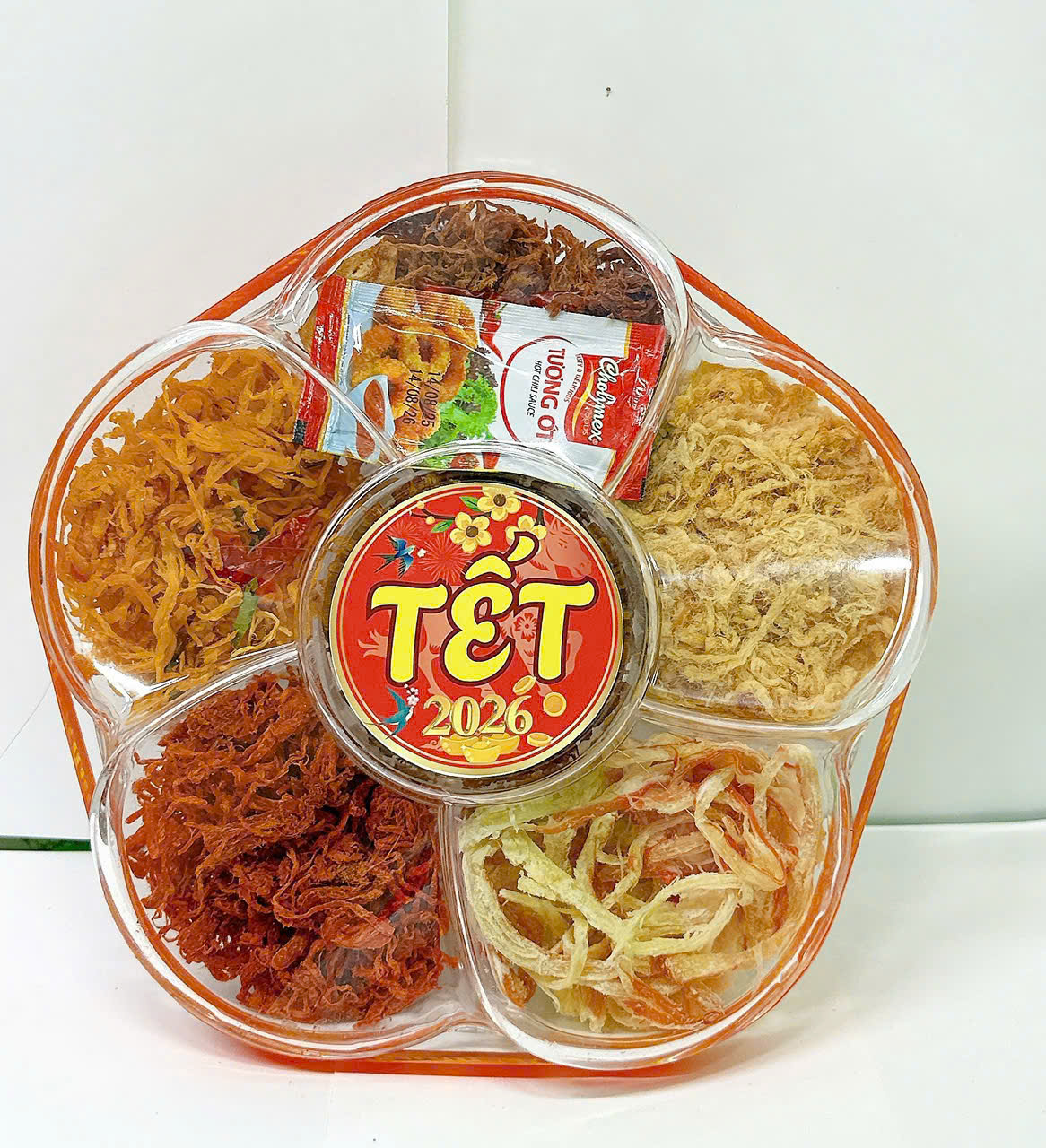 MÔ TẢ: Hộp gồm mực xé, mực dừa, bò sợi ngắn, khô gà lá chanh, khô heo cháy tỏi, chà bông xù,..