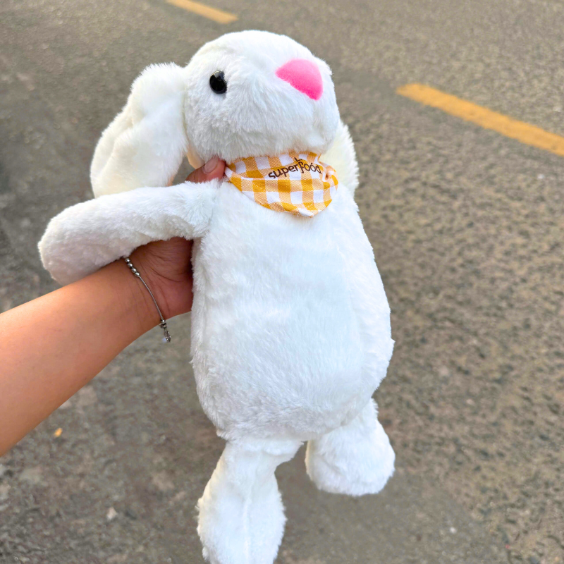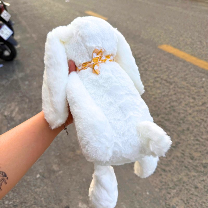 Em thỏ bông trắng tinh, lông siêu mềm, tai dài rũ xuống cực kỳ dễ thương. Điểm nhấn là chiếc khăn caro vàng xinh xắn ở cổ, nhìn vừa ngọt ngào vừa nổi bật.