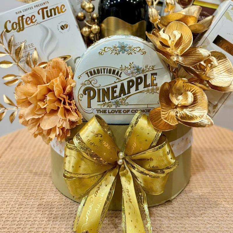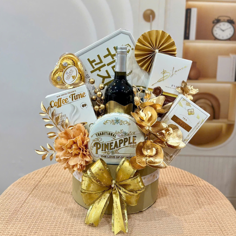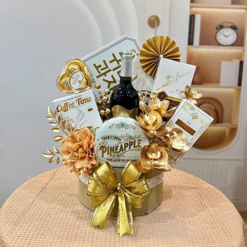 Tông vàng kim chủ đạo, kết hợp hoa – nơ – phụ kiện ánh nhũ giúp tổng thể giỏ quà nổi bật theo cách rất thanh lịch, phù hợp biếu tặng ở mọi mối quan hệ.