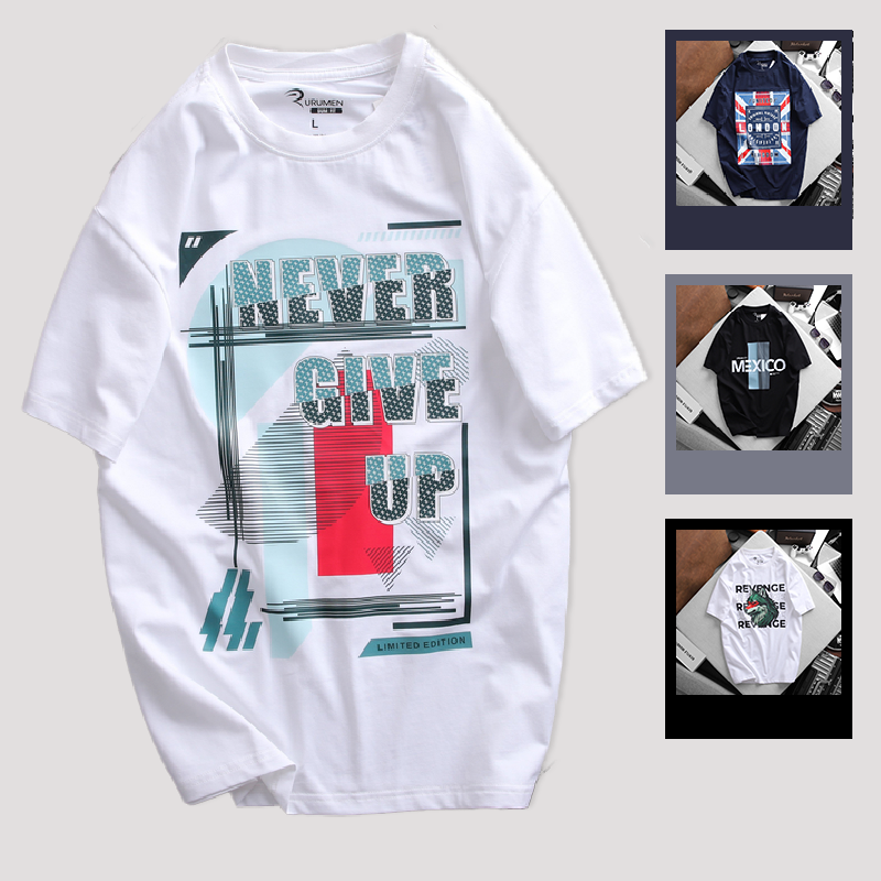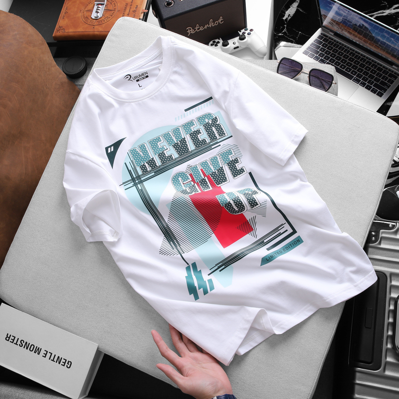Nguồn sỉ áo Thun Nam Cổ Tròn Rurumen Màu Trắng Never Give Up Big Size
