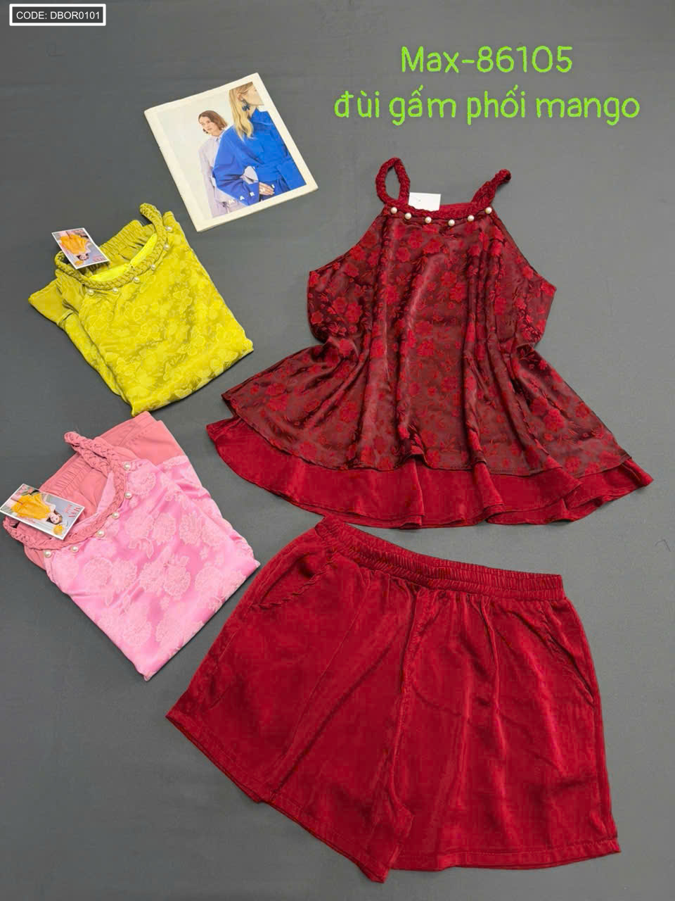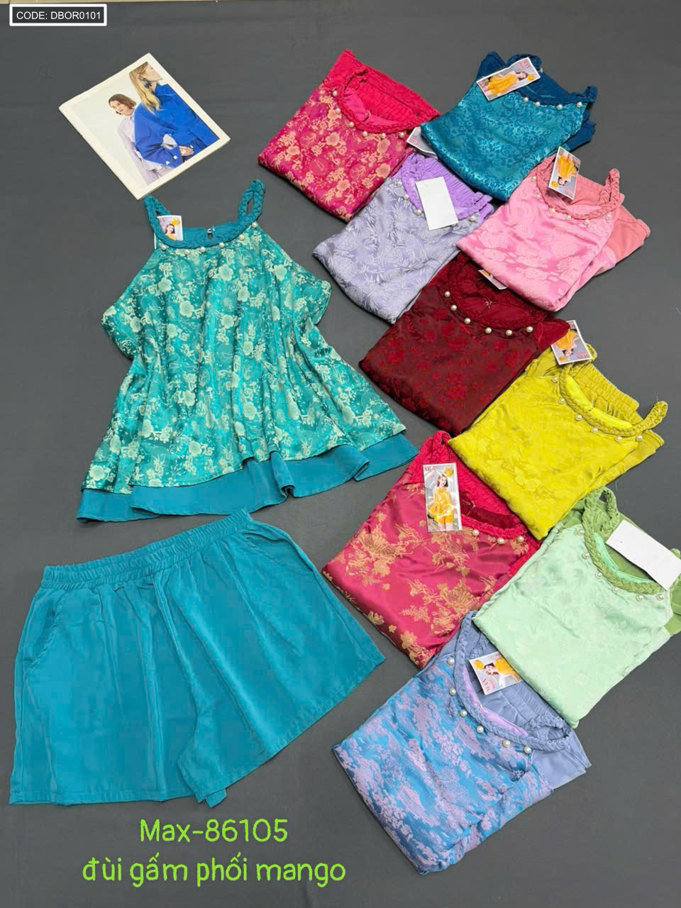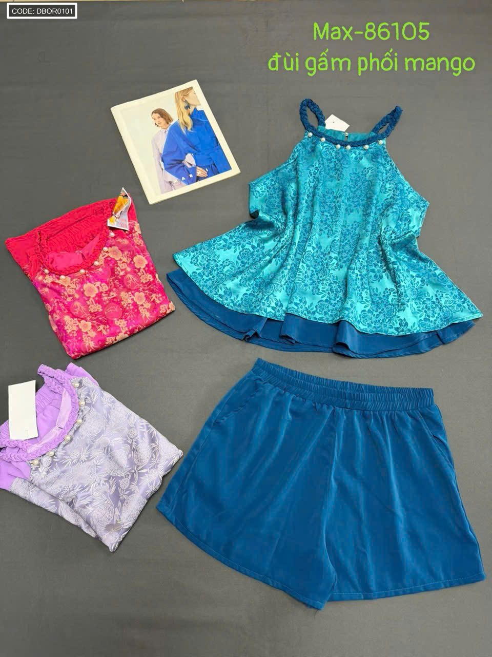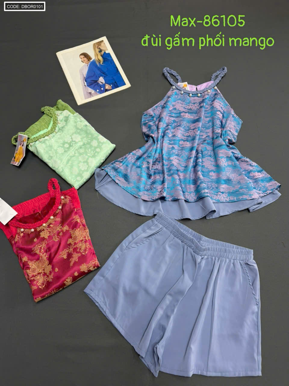 Chuyên sỉ nguồn sỉ đồ bộ nữ cổ yếm quần đùi vải gấm phối mango giá gốc tại TPHCM