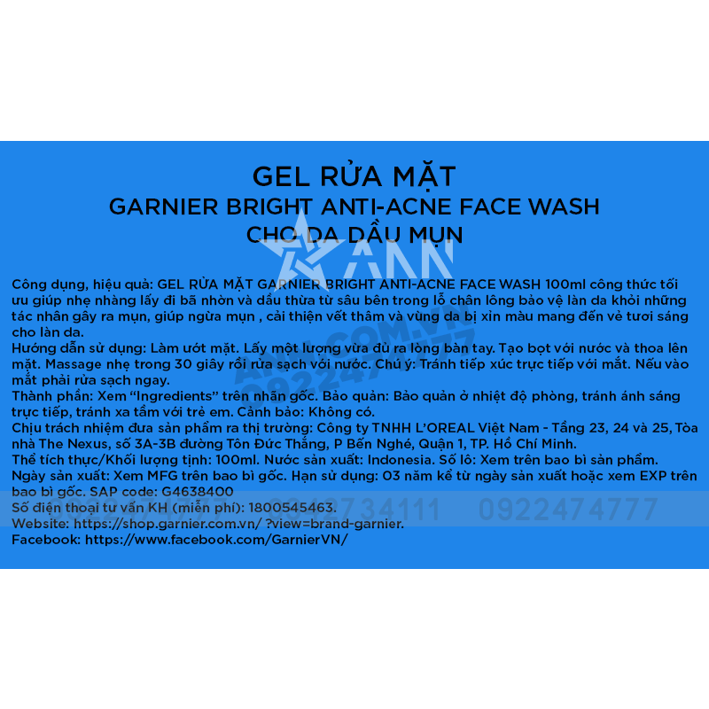 CÔNG DỤNG: GEL RỬA MẶT GARNIER BRIGHT ANTI-ACNE FACE WASH 100ml công thức tối ưu giúp nhẹ nhàng lấy đi bã nhờn và dầu thừa từ sâu bên trong lỗ chân lông bảo vệ làn da khỏi những tác nhân gây ra mụn, giúp ngừa mụn, cải thiện vết thâm và vùng da bị xỉn màu mang đến vẻ tươi sáng cho làn da.
