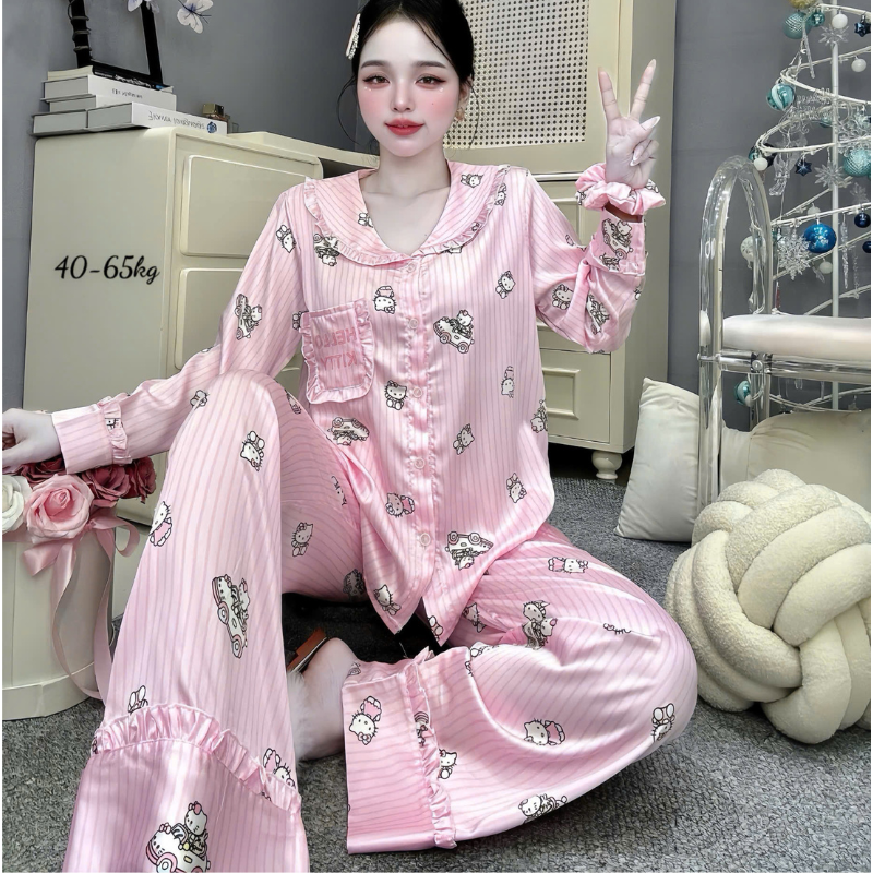 Shop sỉ đồ Bộ Pijama Nữ – Đồ Bộ Tay Dài Quần Dài Viền Bèo Họa Tiết Nhí Size 40-60kg