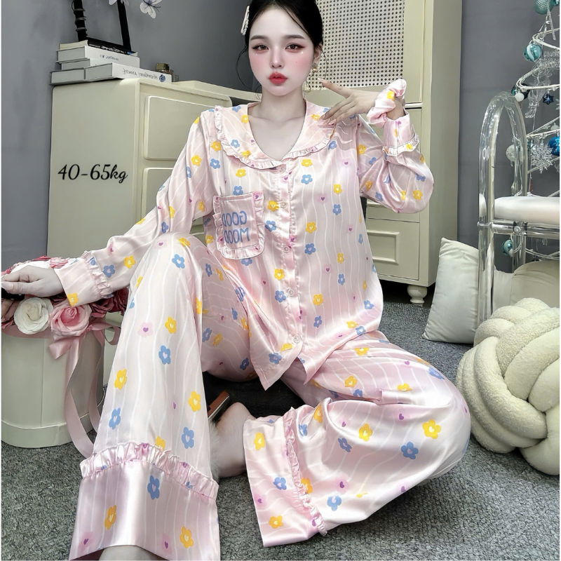 Shop sỉ đồ Bộ Pijama Nữ – Đồ Bộ Tay Dài Quần Dài Viền Bèo Họa Tiết Nhí Size 40-65kg